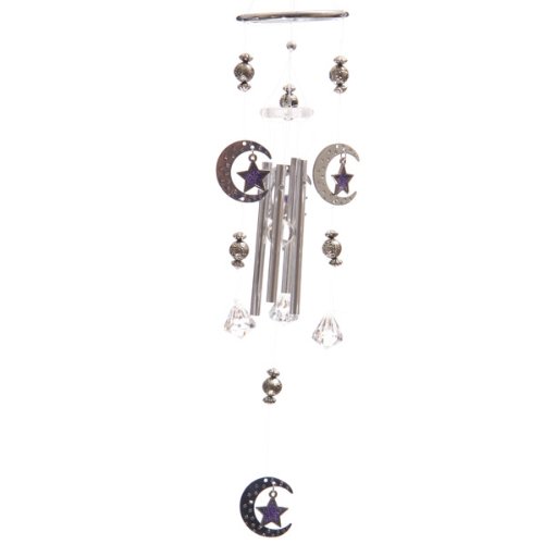 Each Crescent Moon Wind Chime is made from 4 metal moons, set with free-hanging coloured glass stars with added decoration coming from acrylic gemstone beads, all strung together with clear nylon wire and finished with 4 tubular metal chimes. Each Wind Chime is priced and sold separately and comes individually packed in a card box.