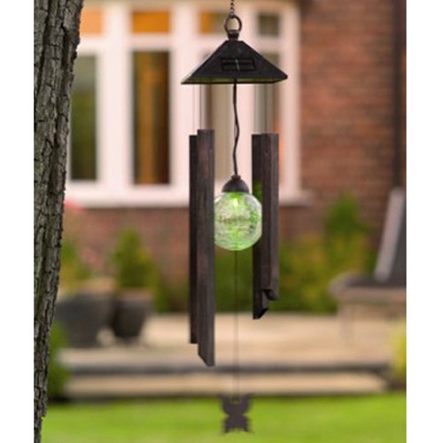This decorative garden item is not just a lovely windchime it is also a solar powered colour changing light. It has four metal wind chimes and a crackle glass pendulum ball striker which lights up thanks to the LEDs inside.