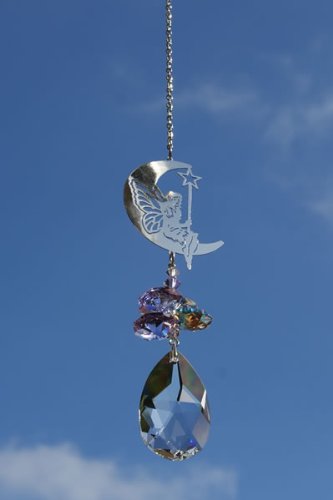 - silver finish fairy sits on a crescent moon- cluster of mauve and clear Swarovski crystals