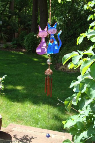 - A pair of cats smile contentedly side by side. Made of blue and mauve acrylic which sparkles as the light catches it, these appealing felines are detailed in copper wire.- A copper spring supports 4 hollow copper chimes which generate soft tinkling tones when the shiny glass marble hanging beneath catches the breeze.