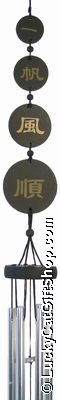 Description:Black wooden wind chimes with Chinese characters which spell out 'Smooth Winds Behind The Sails', which can also be taken as 'May the winds take you far'. This wishes the recipient success for all endeavours, particularly those of a business nature.The wind chimes feature four painted wooden discs increasing in size, each with a Chinese character painted on it in gold. The chrome chimes hang below, with a central chrome clapper. A final black disc, with Chinese character inscribed on it, hangs from the bottom of the clapper to catch the wind.